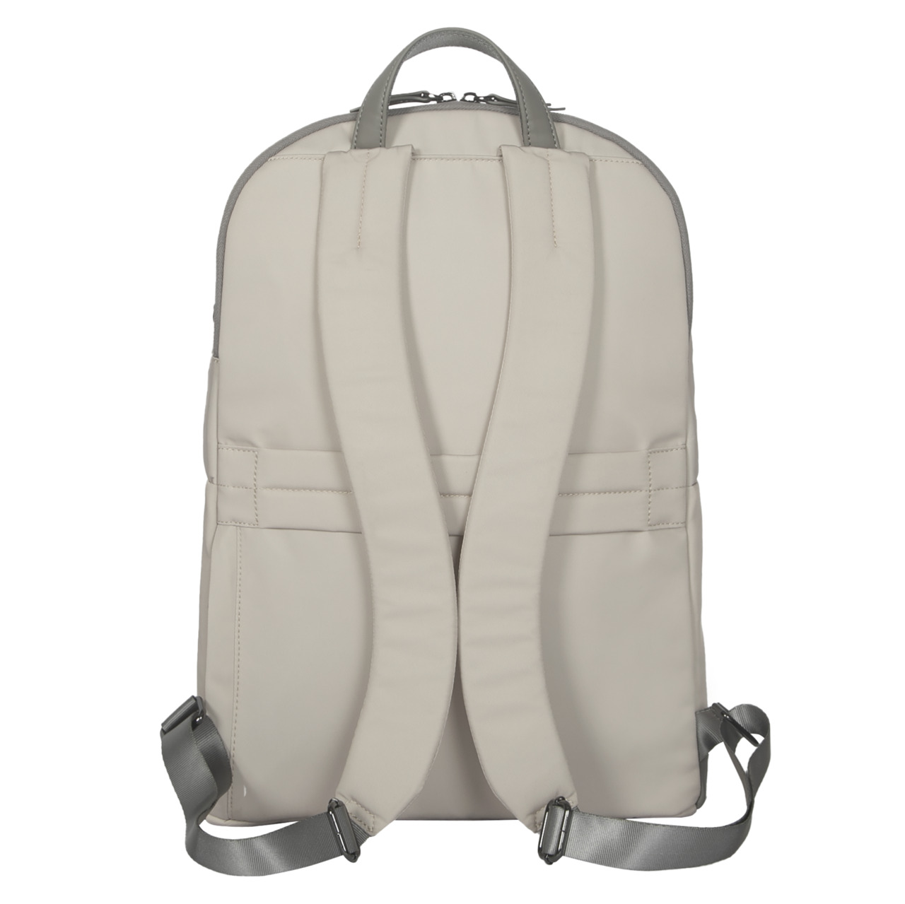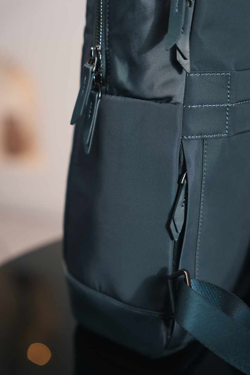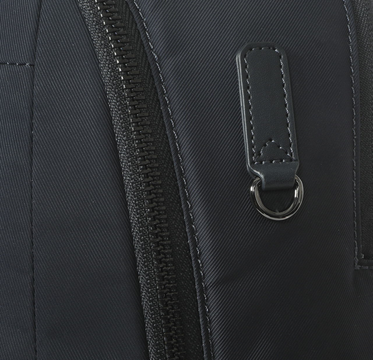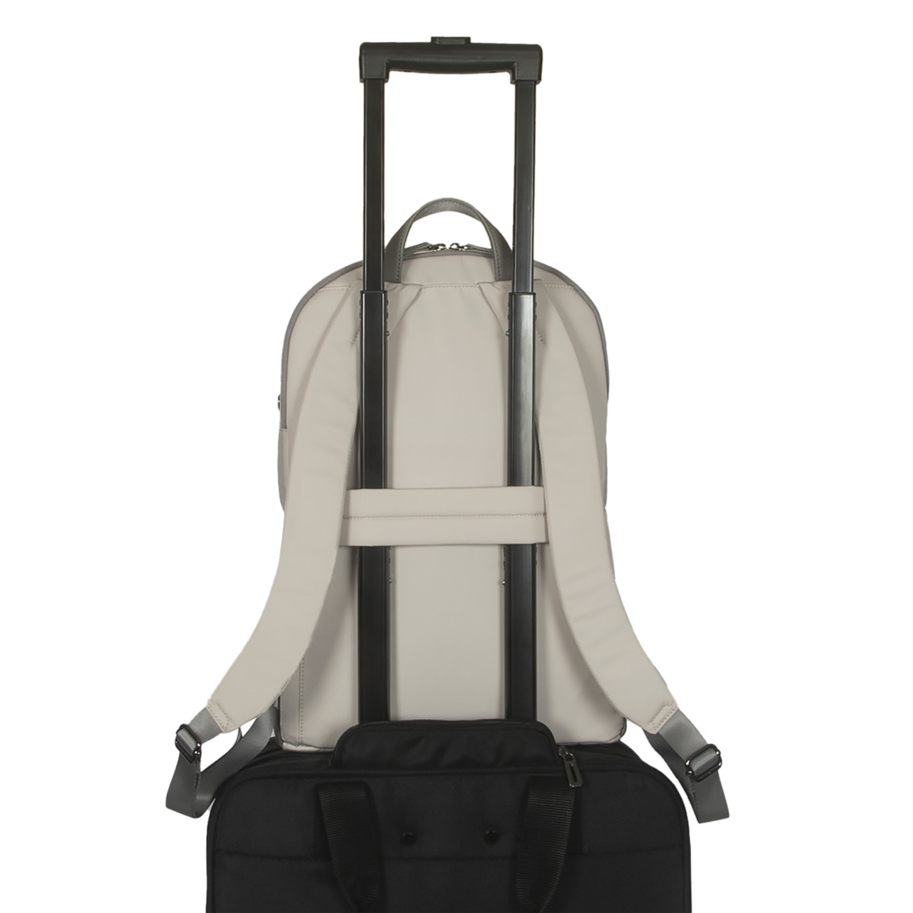 - 專用拉鏈筆電隔層,保護筆記型電腦安全 - 15公升次要隔層,內含一個拉鏈袋和四個滑袋,便於分門別類收納 - 前置便捷拉鏈袋,快速存取手機、八達通等隨身小物 - 隱藏背部安全袋,額外保障貴重物品安全 - 可調節軟墊肩帶與柔軟頂部手柄,提升背負與提拿舒適感 - 行李箱固定帶,輕鬆扣於拉桿行李箱上,方便出行 - 明亮內裡,輕鬆找到包內物品 - 防水記憶布料,耐用且抗潑水 - 高級金屬配件與素皮細節,質感與時尚兼具