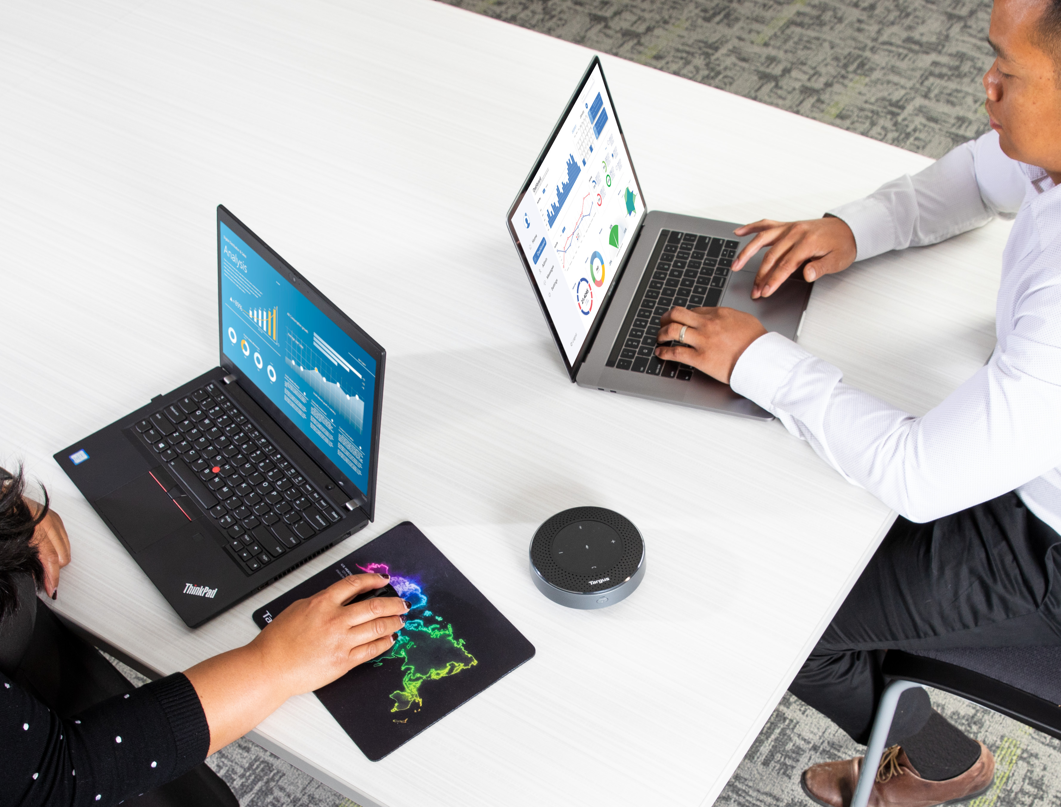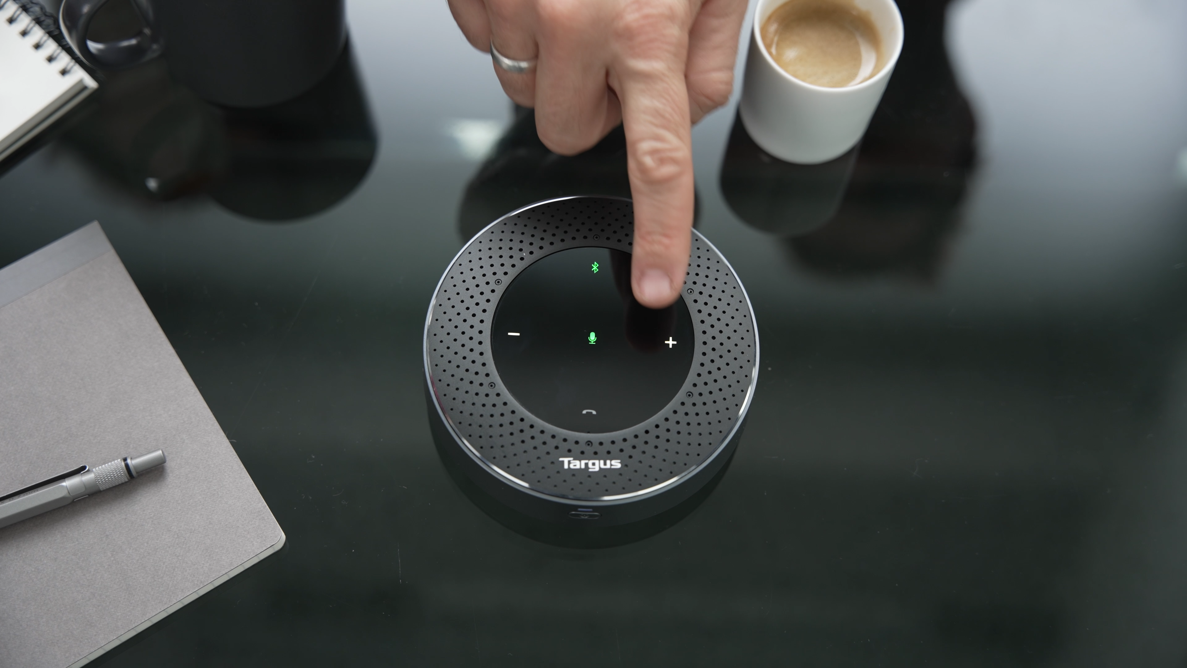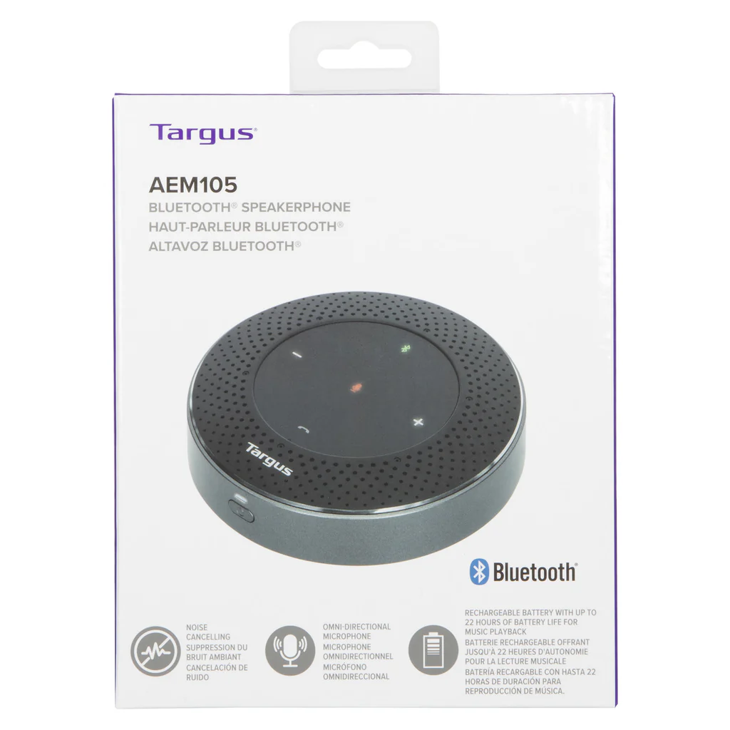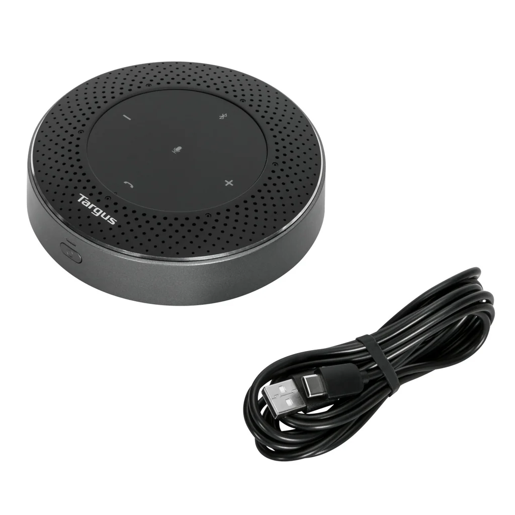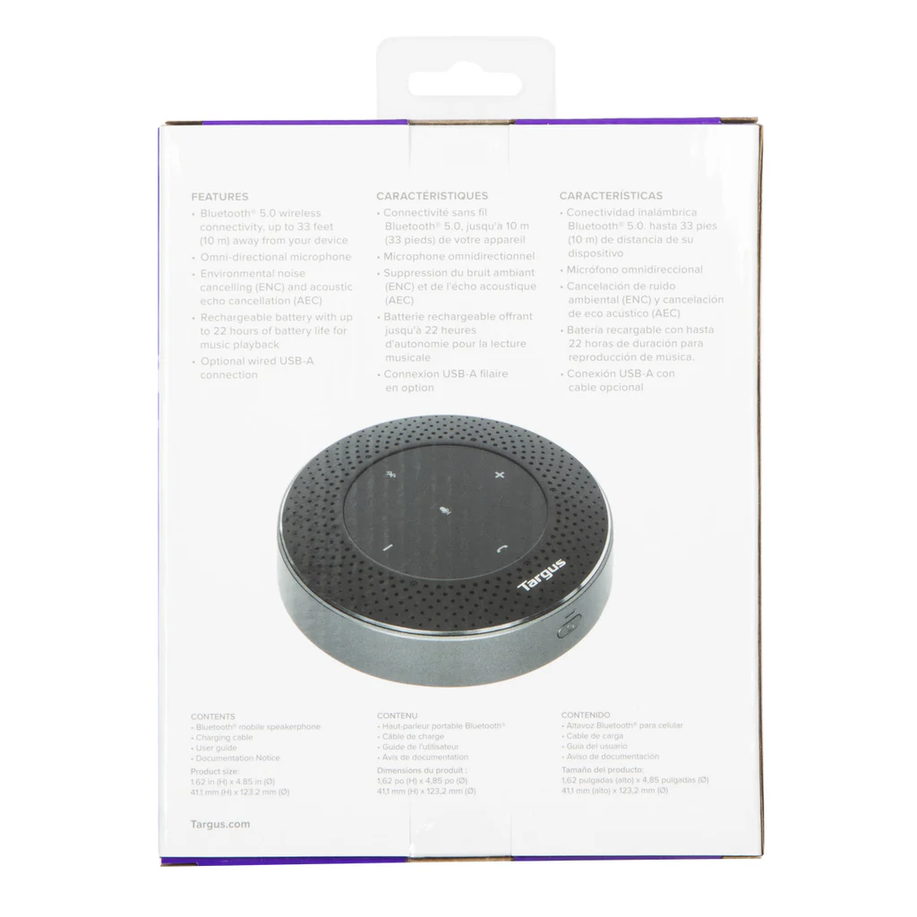 產品特性 • 輕巧便攜設計:圓盤造型,尺寸為 4.85” 寬 x 1.62” 高 • 多種連接方式:可透過 USB 或 Bluetooth® 5.0 無線連接,距離最遠可達 33 英尺 / 10 公尺,適用於筆記型電腦、平板或手機 • 6 組全向性麥克風:360° 收音,靈敏度可達 16 英尺 / 5 公尺 • 環境噪音消除 (ENC) • 聲學回音消除 (AEC) • 可充電 2600 mAh 鋰電池:通話時間最長可達 13 小時,音樂播放最長可達 22 小時(附 USB 充電線) • 簡易操作:具備直覺式控制與語音提示(如「開/關」、「已連接」、「已斷開」) • 通用相容性:支援多數主流線上會議平台 • 跨平台支援:可搭配 Windows、macOS、iOS 與 Android 使用 隨時隨地將任何空間轉換為協作環境,透過超便攜、易於連接的 Targus Bluetooth 行動揚聲器,輕鬆進行會議通話。